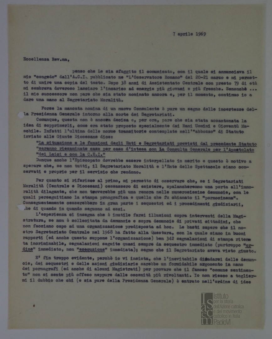 Osservazioni su alcune modifiche in seno alla struttura dell'ACI con particolare riferimento alla necessità di un potenziamento dei segretariati centrale e diocesani della moralità. Dattiloscritto