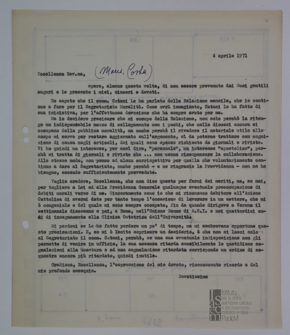 Mons. Prosperini invia osservazioni sul suo coinvolgimento a vario titolo nell'azione cattolica in difesa della pubblica moralità. Dattiloscritto