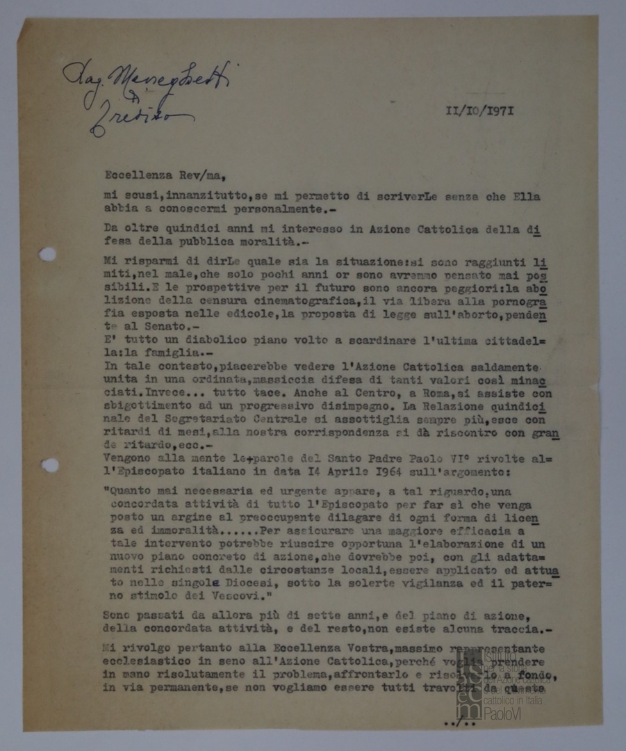 Giuseppe Meneghetti scrive a Franco Costa sulla difesa della pubblica moralità con riferimento al progressivo disimpegno dei cattolici e in particolare del Segretariato della moralità. Dattiloscritto