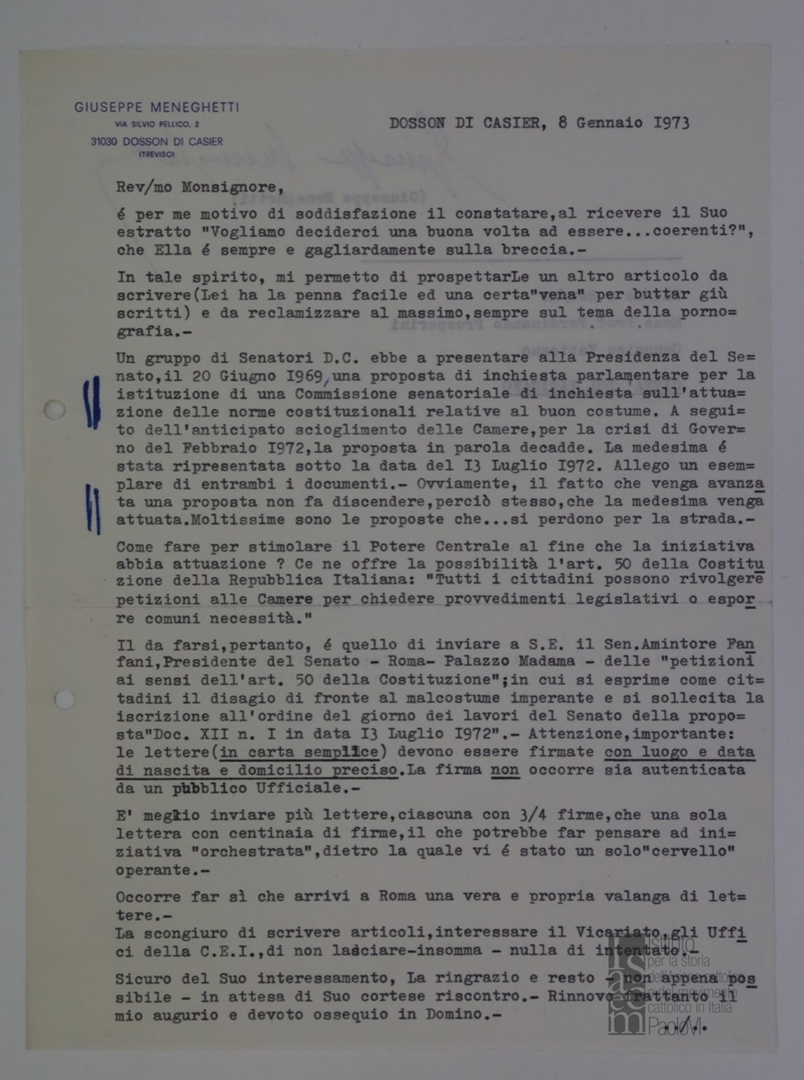 Giuseppe Meneghetti propone a mons. Ferdinando Prosperini la stesura di un articolo sulla pornografia destinato a sollecitare l'azione parlamentare per la difesa del buon costume. Dattiloscritto