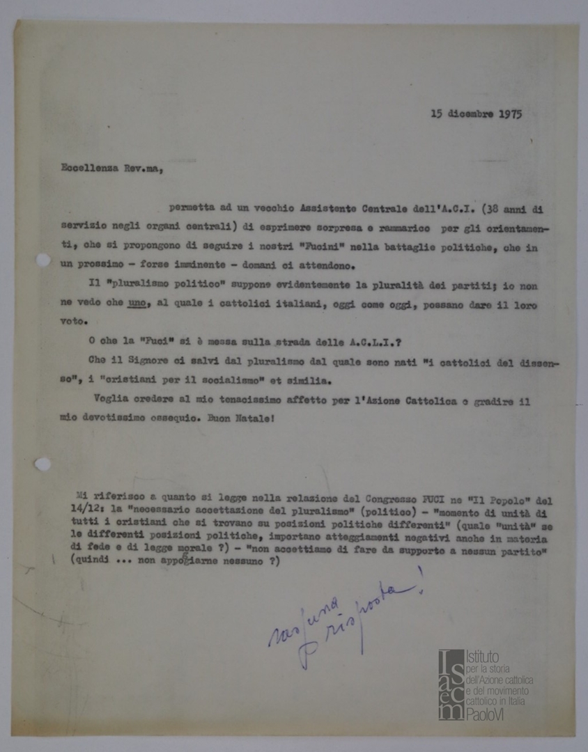 Osservazioni in riferimento all'articolo apparso su "Il Popolo" a proposito del congresso della Federazione universitaria cattolica italiana - FUCI sui temi del pluralismo politico. Dattiloscritto