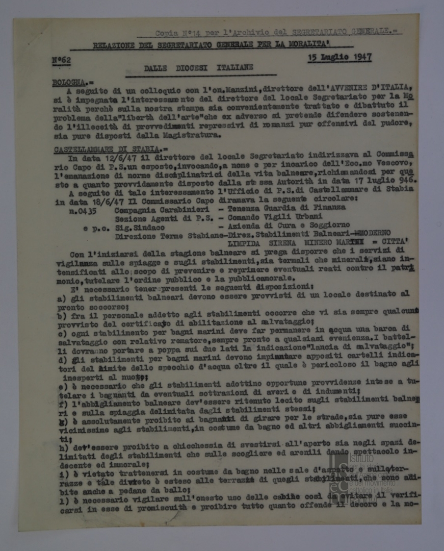 "Relazione del Segretariato Generale per la Moralità. Nr. 62"