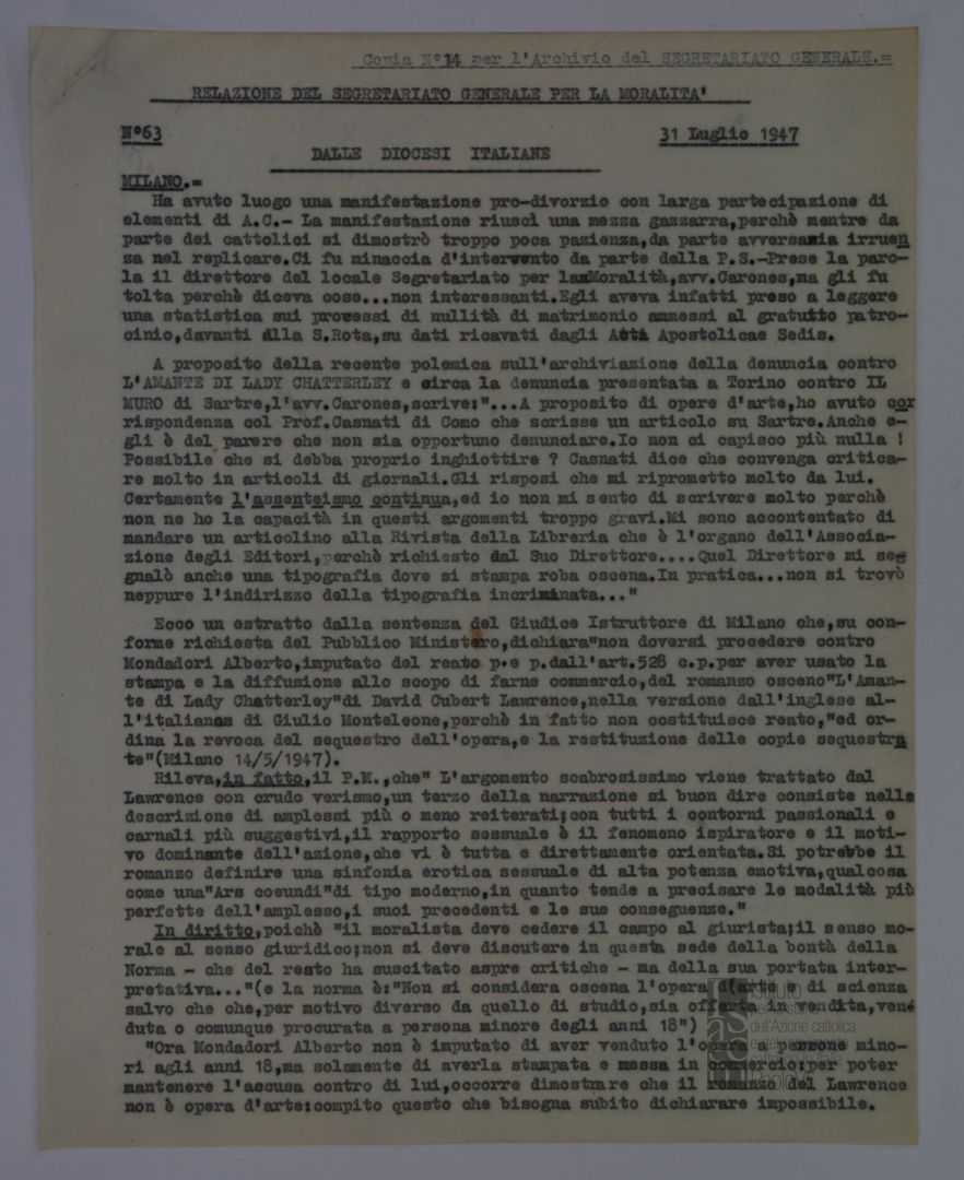 "Relazione del Segretariato Generale per la Moralità. Nr. 63"