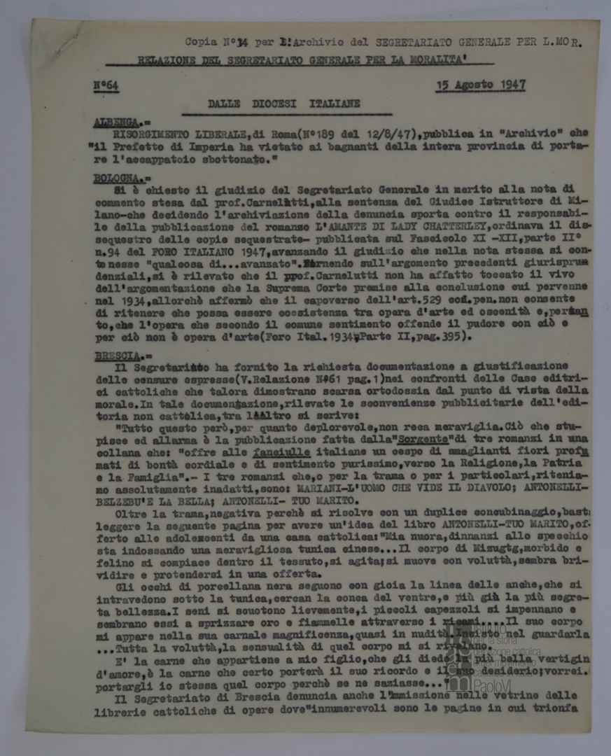 "Relazione del Segretariato Generale per la Moralità. Nr. 64"