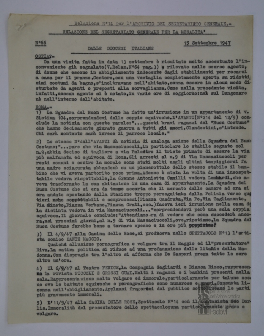 "Relazione del Segretariato Generale per la Moralità. Nr. 66"