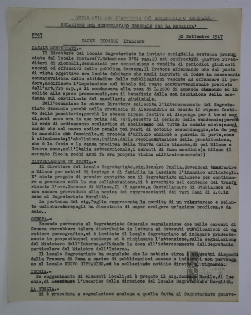 "Relazione del Segretariato Generale per la Moralità. Nr. 67"