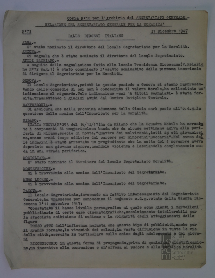 "Relazione del Segretariato Generale per la Moralità. Nr. 73"