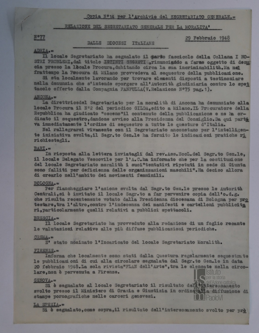 "Relazione del Segretariato Generale per la Moralità. Nr. 77"