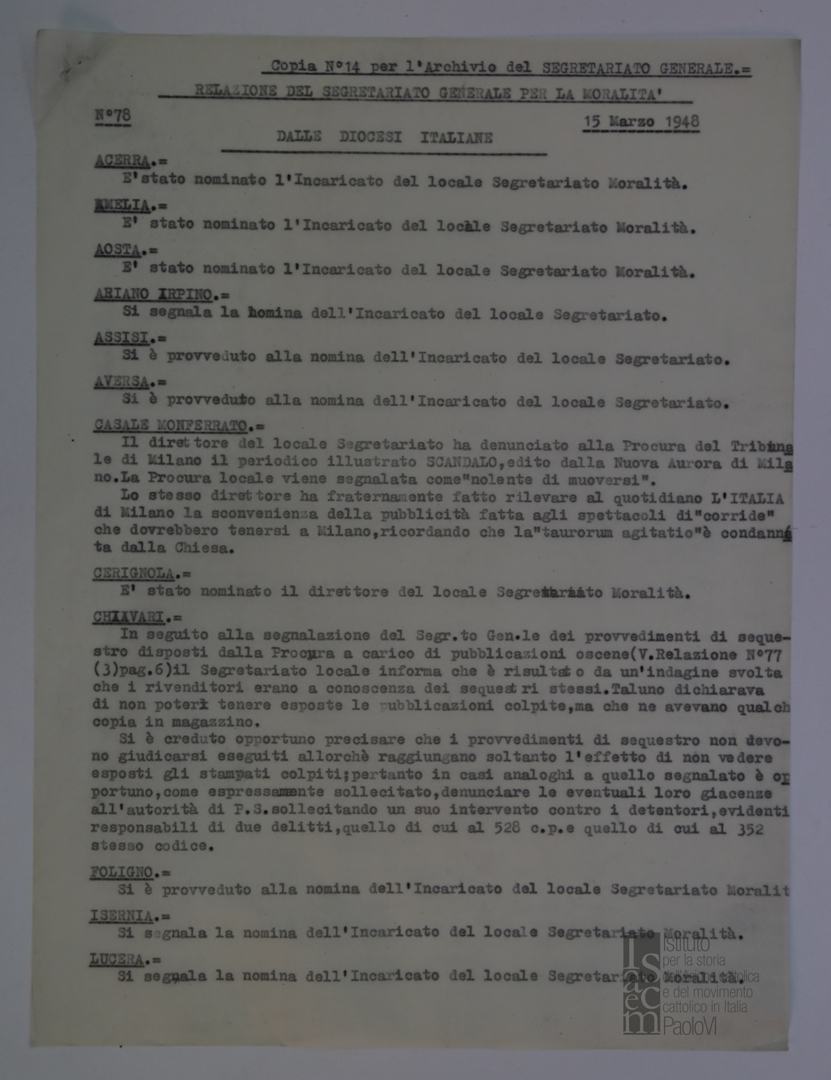 "Relazione del Segretariato Generale per la Moralità. Nr. 78"