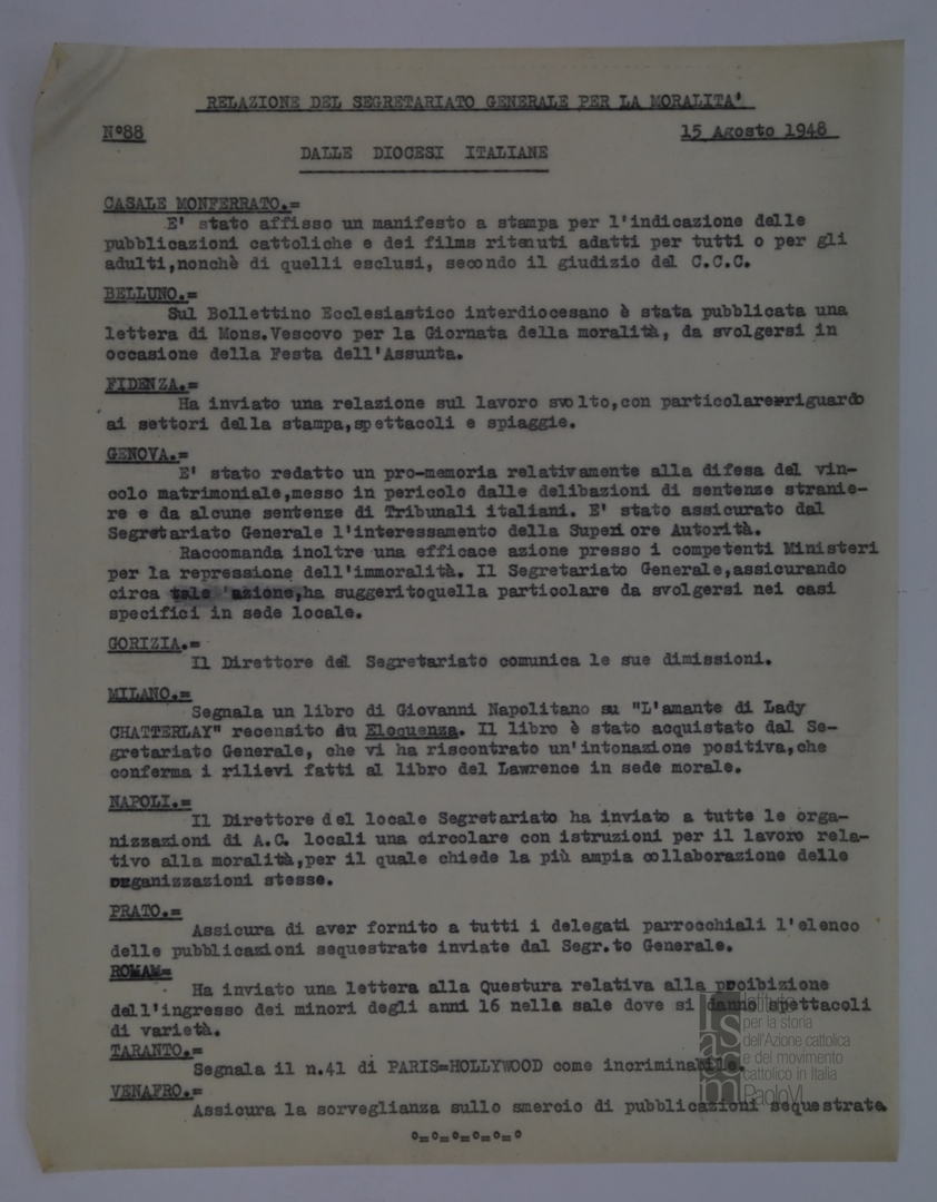 Resoconto delle informazioni sulla pubblica moralità pervenute dalle diocesi italiane. Dattiloscritto