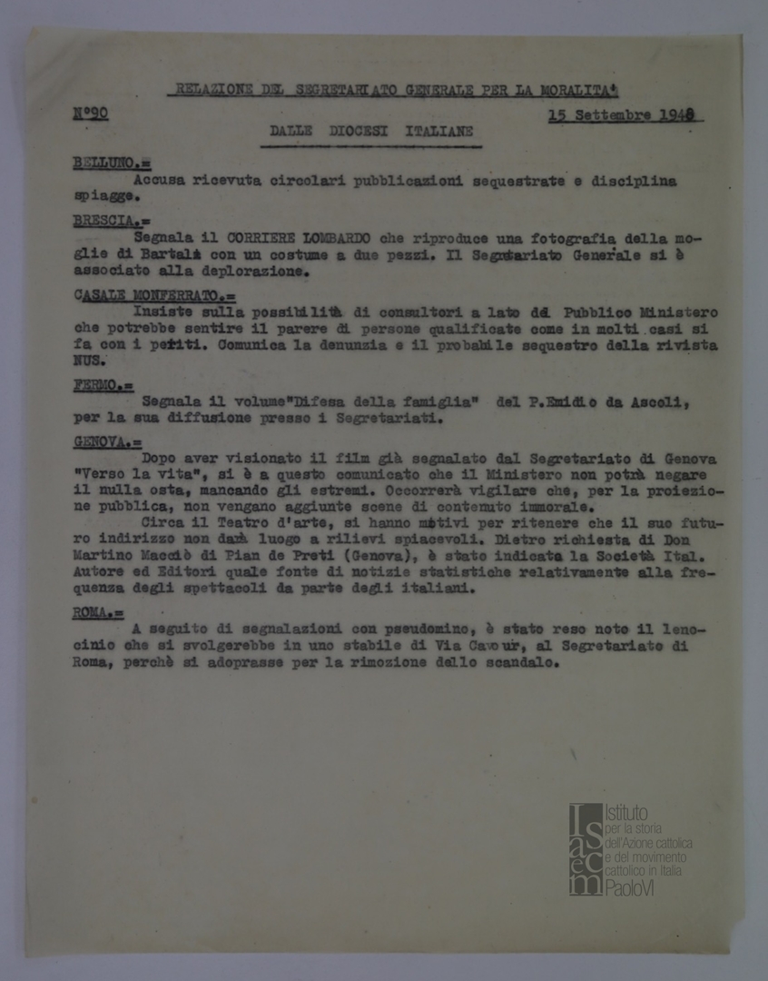 "Relazione del Segretariato Generale per la Moralità. Nr. 90"