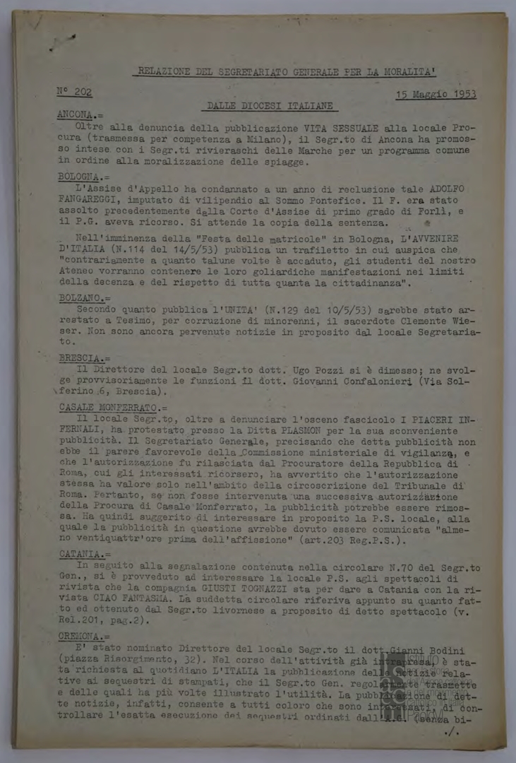 "Relazione del Segretariato Generale per la Moralità. Nr. 202"