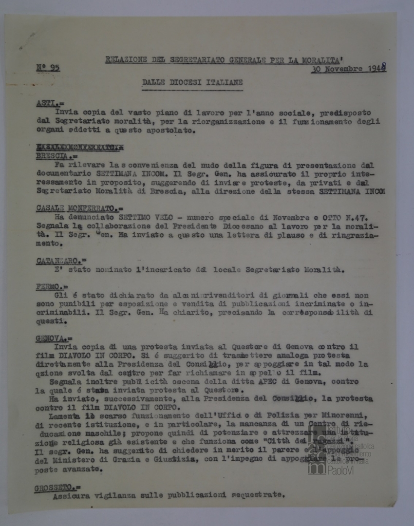 "Relazione del Segretariato Generale per la Moralità. Nr. 95"