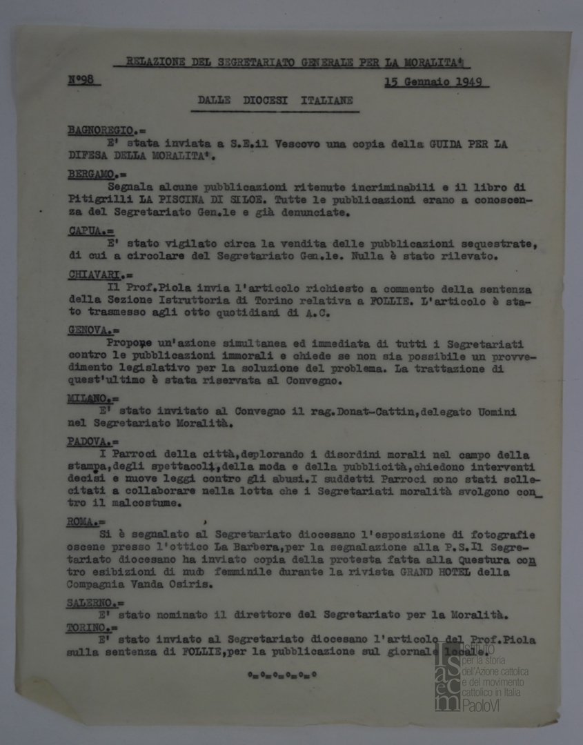 "Relazione del Segretariato Generale per la Moralità. Nr. 98"