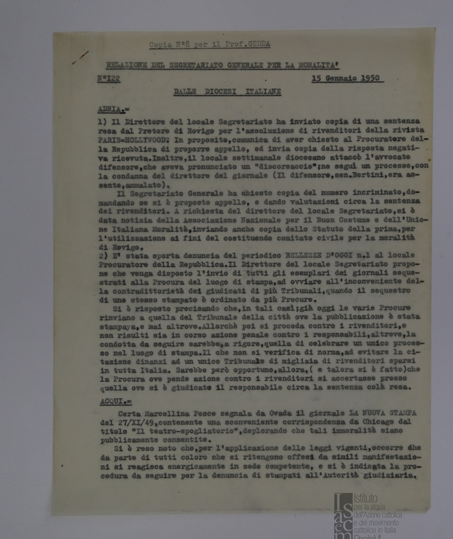 "Relazione del Segretariato Generale per la Moralità. Nr. 122"