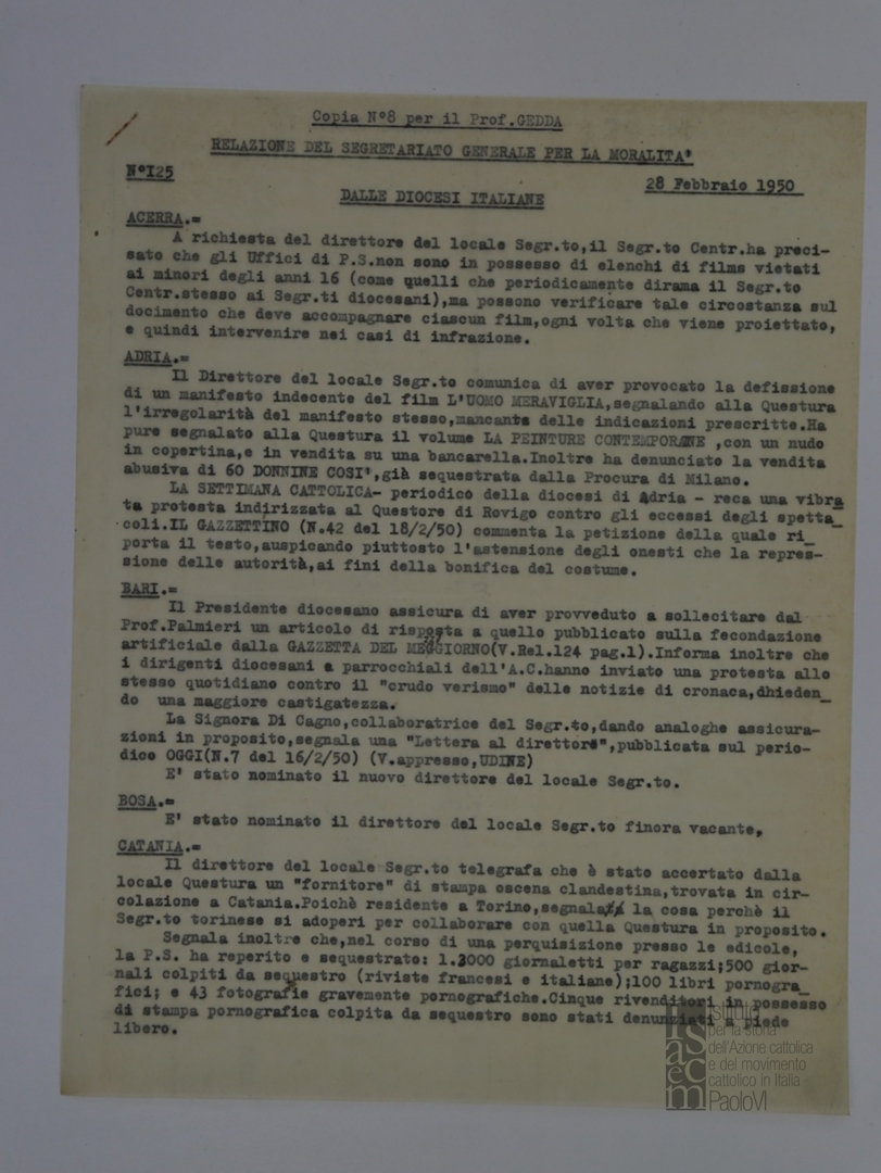 Resoconto delle informazioni sulla pubblica moralità pervenute dalle diocesi italiane e da Roma. Dattiloscritto