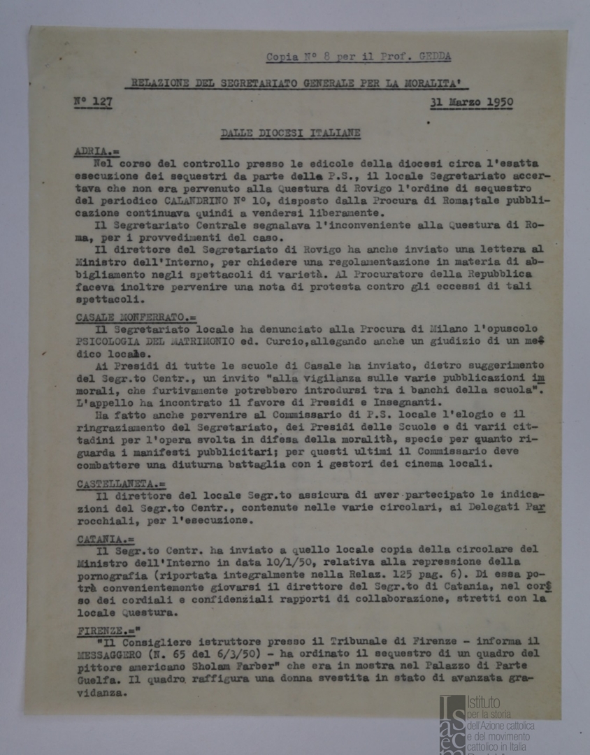 "Relazione del Segretariato Generale per la Moralità. Nr. 127"