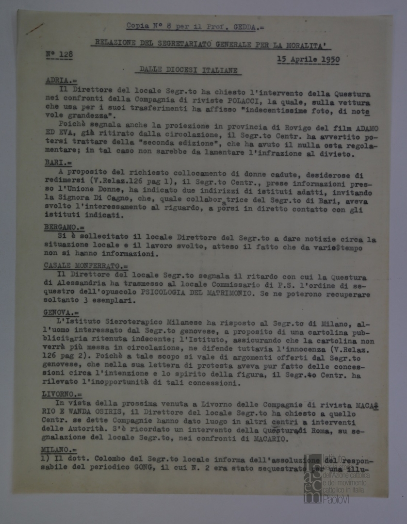 "Relazione del Segretariato Generale per la Moralità. Nr. 128"
