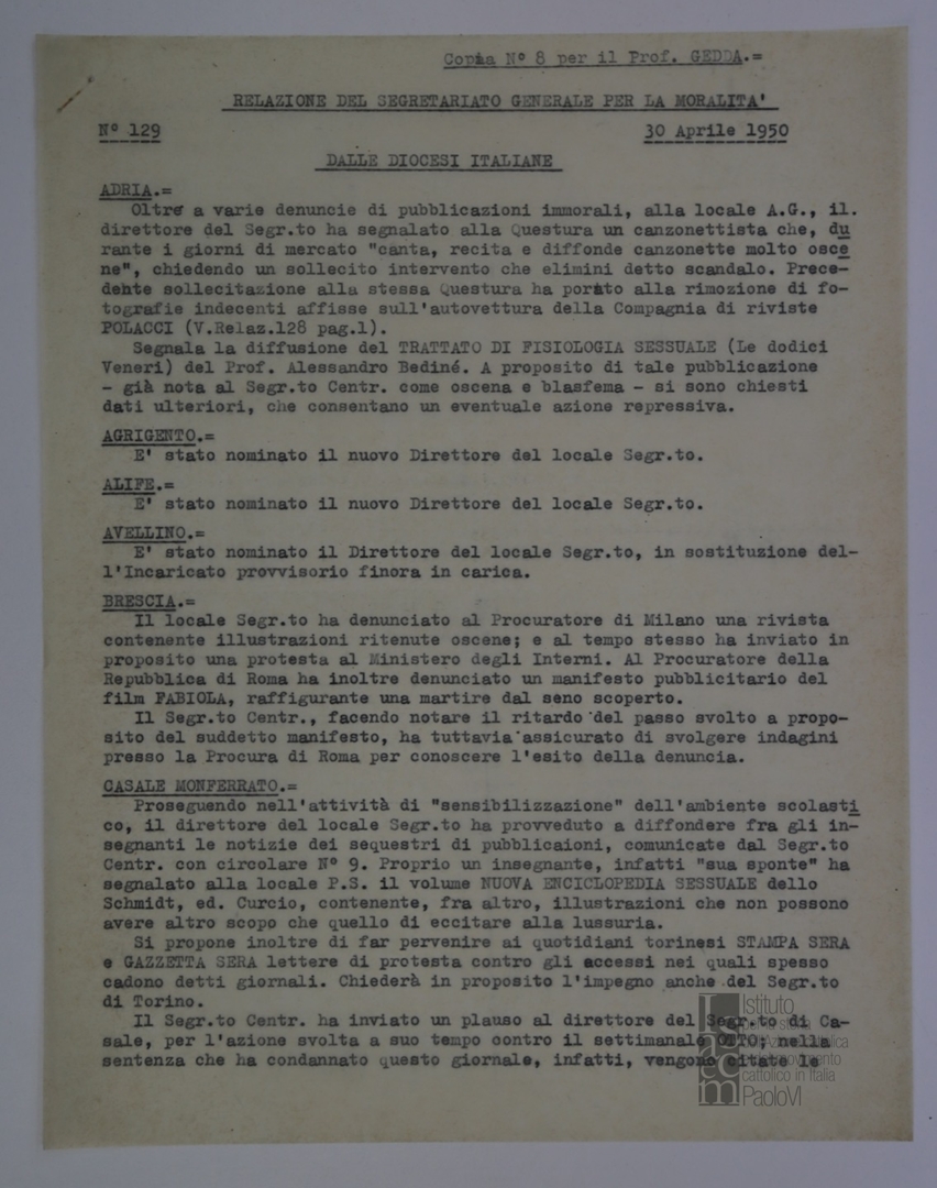 "Relazione del Segretariato Generale per la Moralità. Nr. 129"