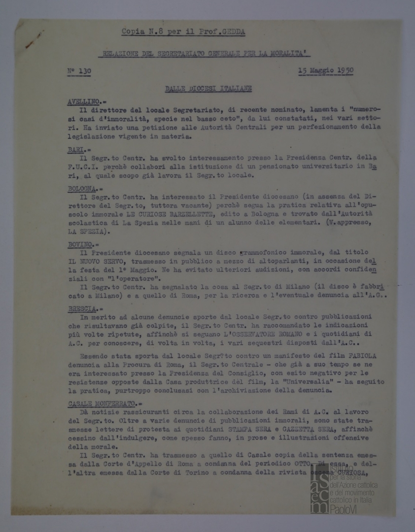 Resoconto delle informazioni sulla pubblica moralità pervenute dalle diocesi italiane e da Roma. Dattiloscritto
