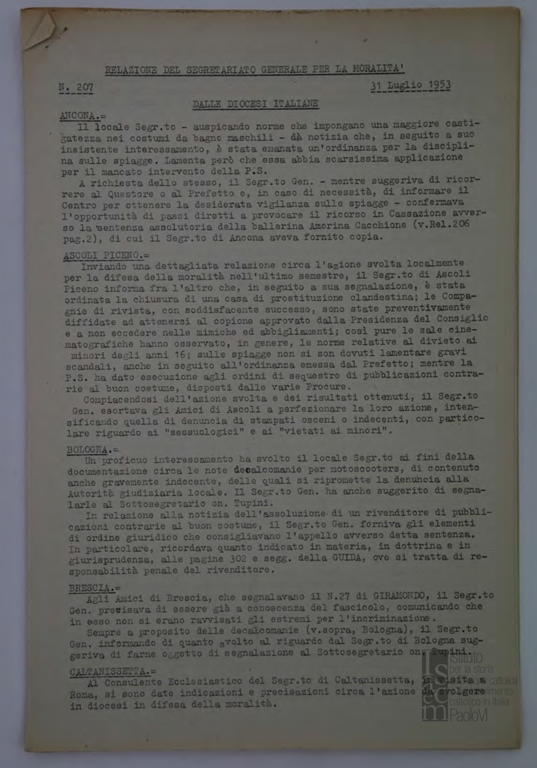 "Relazione del Segretariato Generale per la Moralità. Nr. 207"