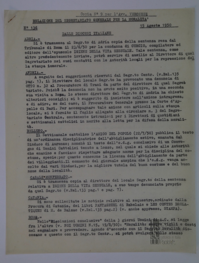 "Relazione del Segretariato Generale per la Moralità. Nr. 136"