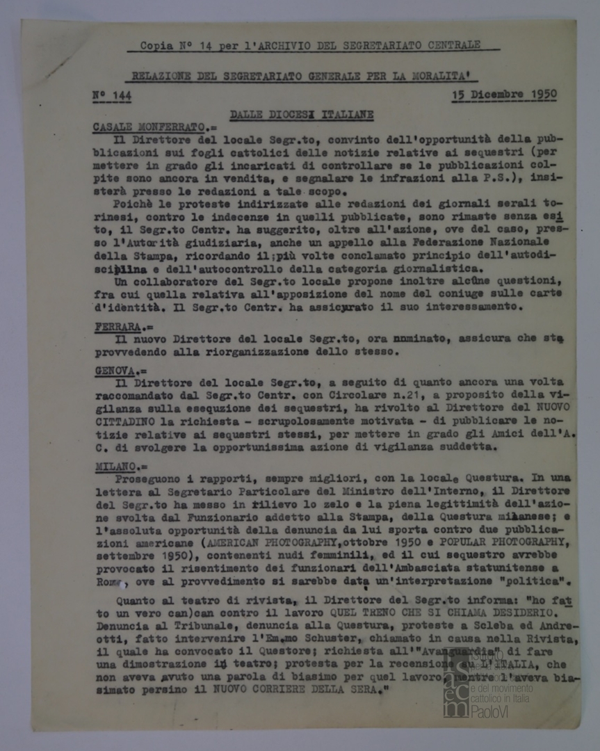 "Relazione del Segretariato Generale per la Moralità. Nr. 144"