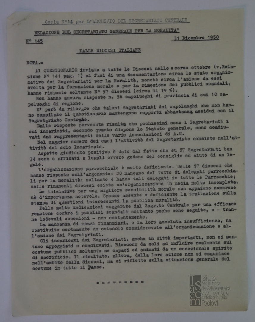 "Relazione del Segretariato Generale per la Moralità. Nr. 145"