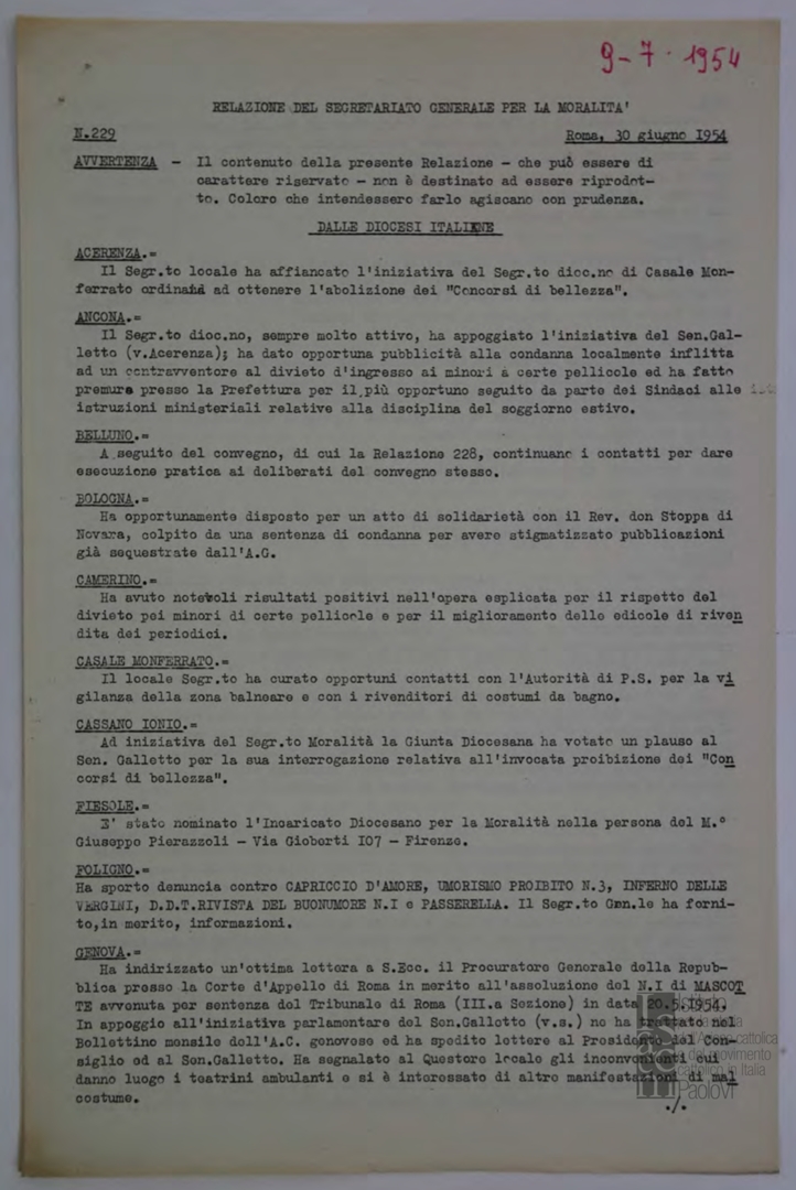 "Relazione del Segretariato Generale per la Moralità. Nr. 229"