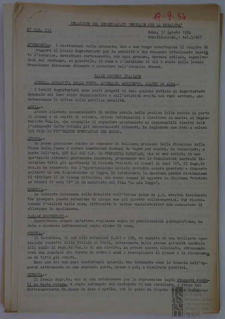 Resoconto delle informazioni sulla pubblica moralità pervenute dalle diocesi italiane e da Roma. Dattiloscritto