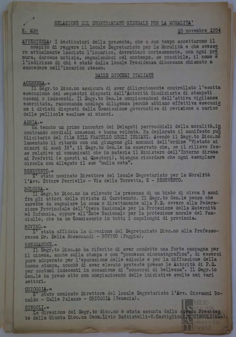 "Relazione del Segretariato Generale per la Moralità. Nr. 238"