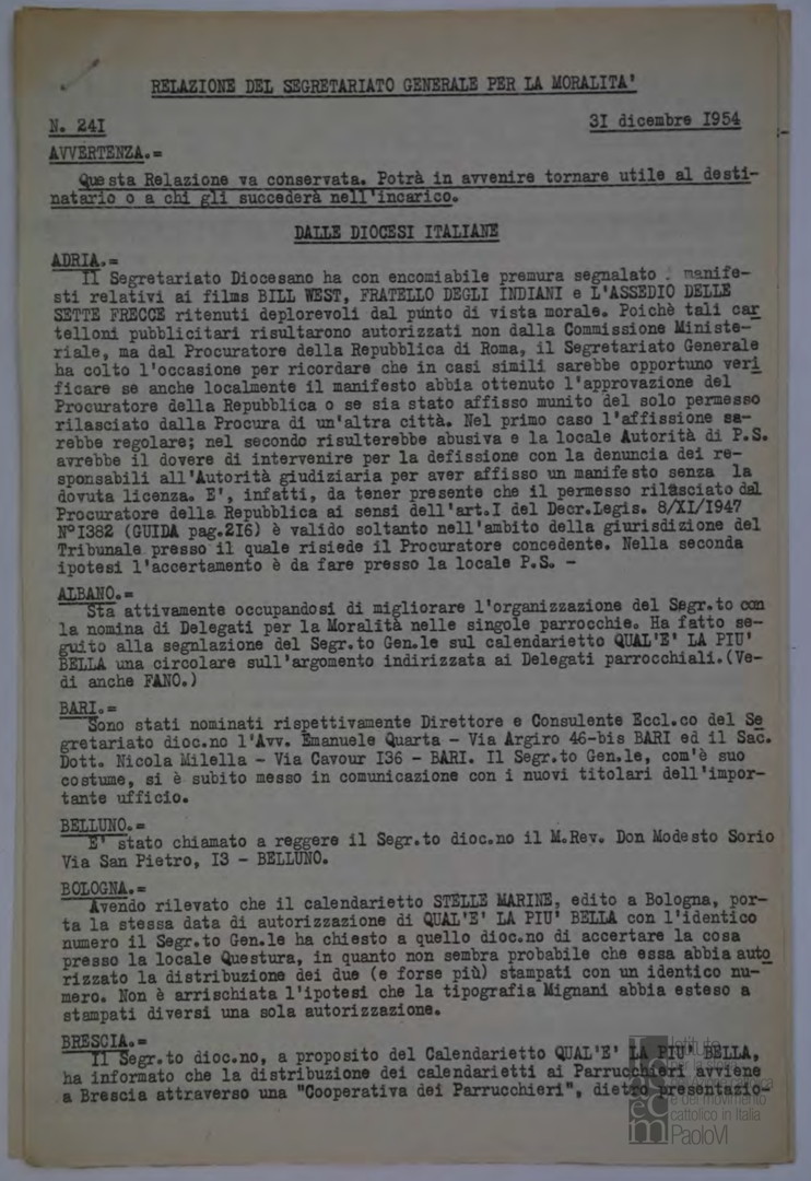 "Relazione del Segretariato Generale per la Moralità. Nr. 241"