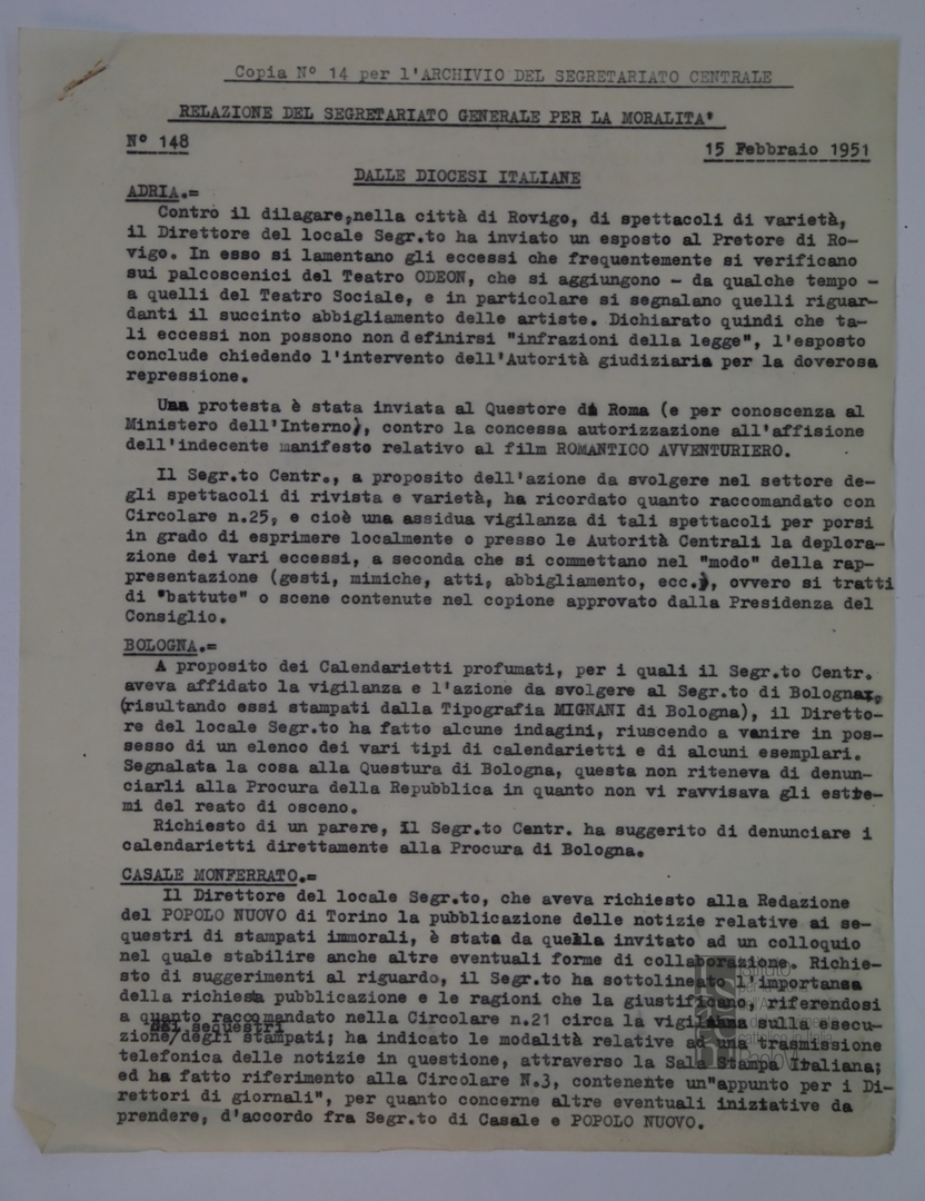 "Relazione del Segretariato Generale per la Moralità. Nr. 148"