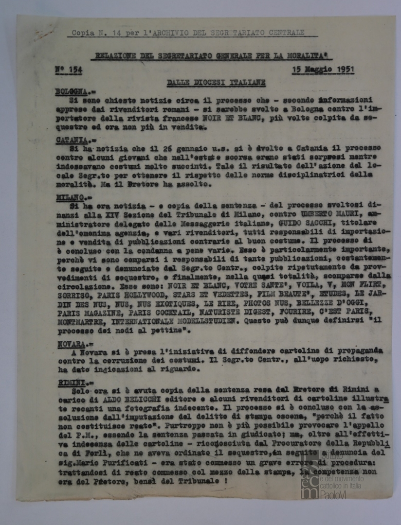 "Relazione del Segretariato Generale per la Moralità. Nr. 154"