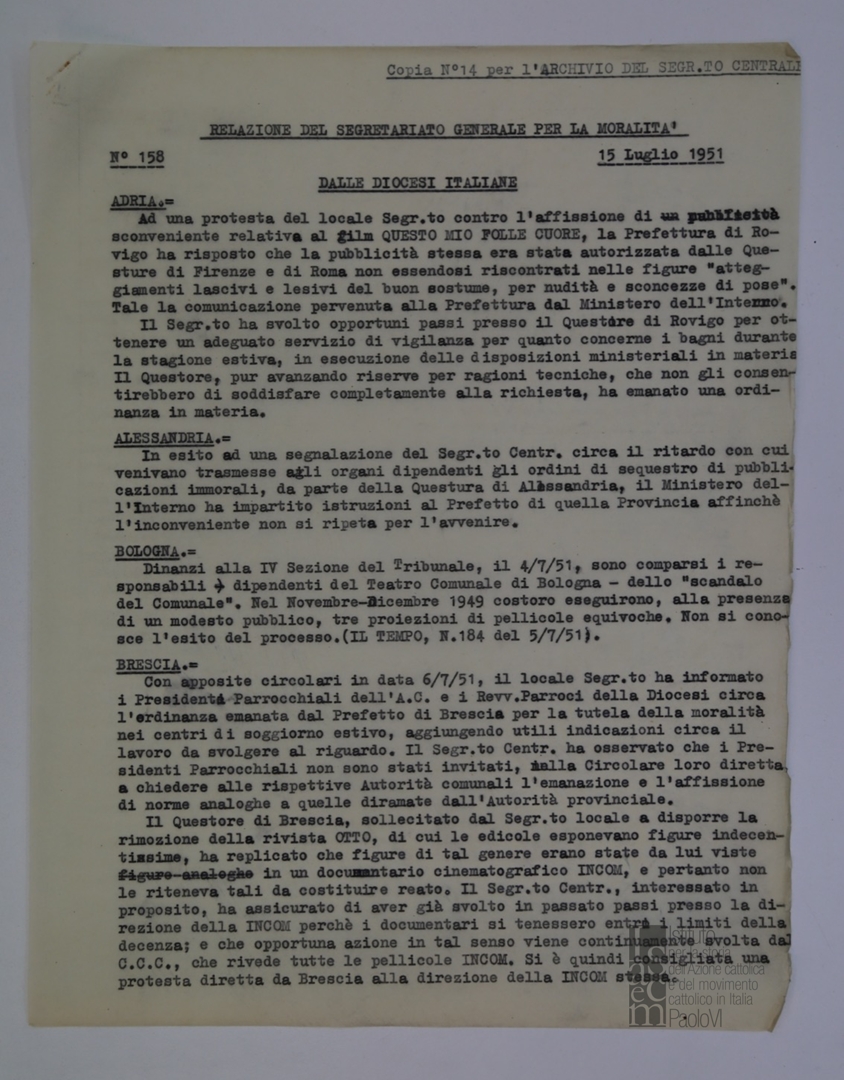 "Relazione del Segretariato Generale per la Moralità. Nr. 158"