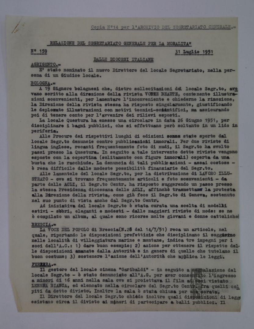 "Relazione del Segretariato Generale per la Moralità. Nr. 159"