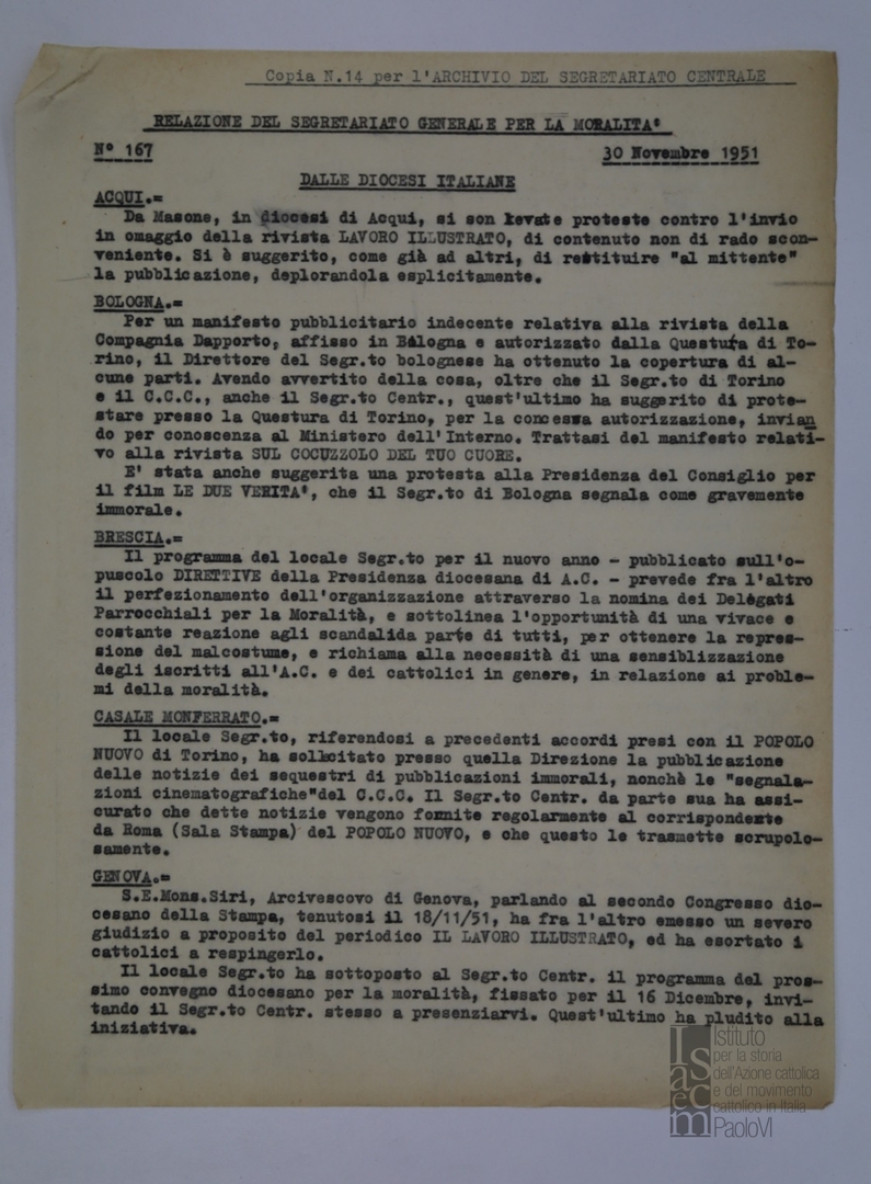 "Relazione del Segretariato Generale per la Moralità. Nr. 167"