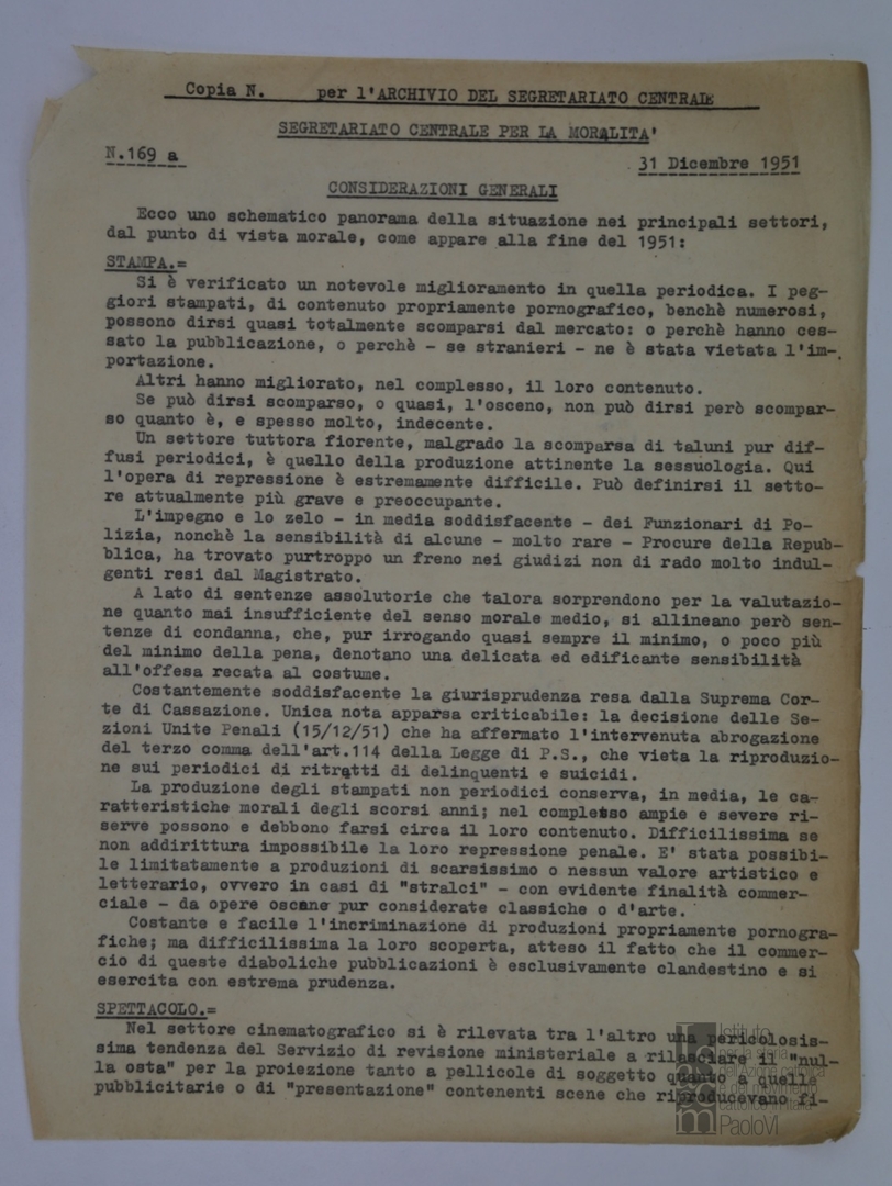 "Relazione del Segretariato Generale per la Moralità. Nr. 169 a. Considerazioni generali"