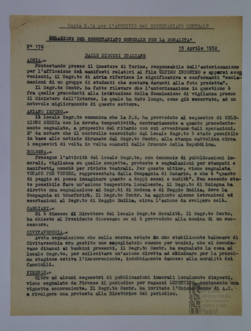 "Relazione del Segretariato Generale per la Moralità. Nr. 176"
