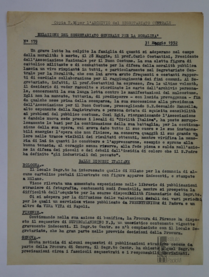 "Relazione del Segretariato Generale per la Moralità. Nr. 179"