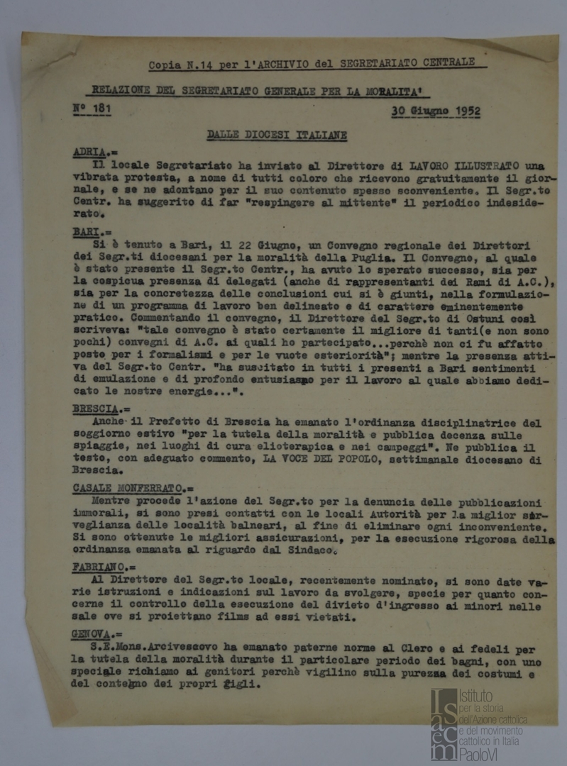 "Relazione del Segretariato Generale per la Moralità. Nr. 181"
