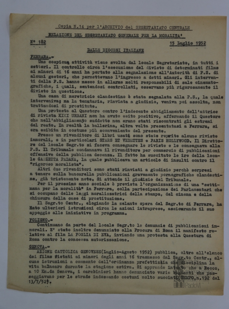"Relazione del Segretariato Generale per la Moralità. Nr. 182"