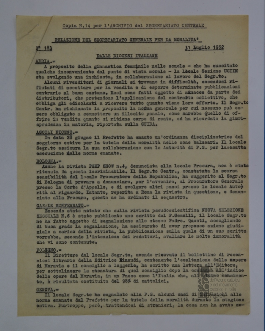"Relazione del Segretariato Generale per la Moralità. Nr. 183"