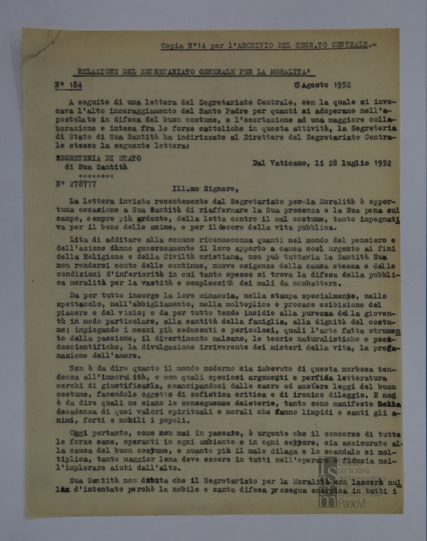 "Relazione del Segretariato Generale per la Moralità. Nr. 184"