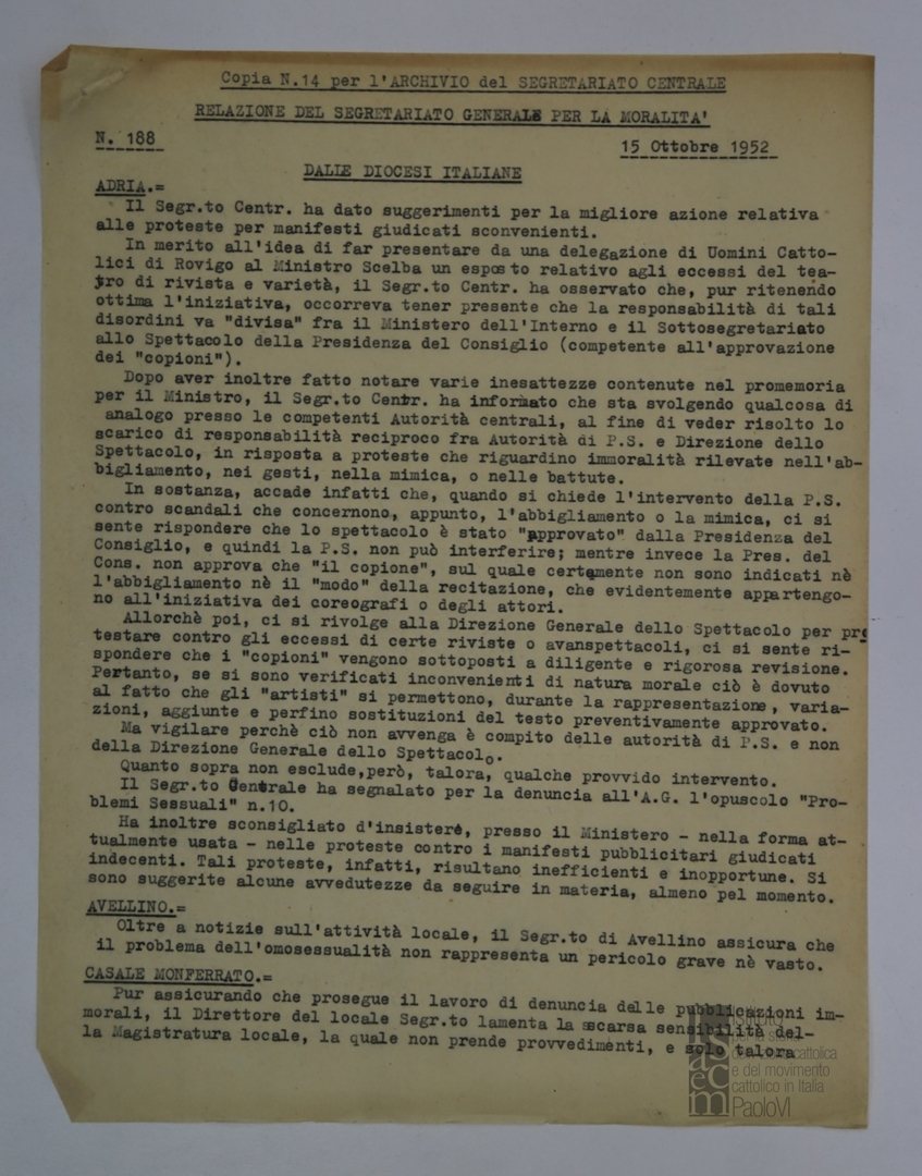Resoconto delle informazioni sulla pubblica moralità pervenute dalle diocesi italiane e da Roma. Dattiloscritto