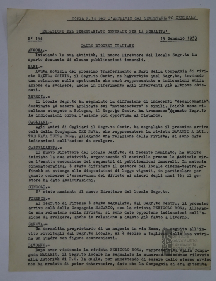 "Relazione del Segretariato Generale per la Moralità. Nr. 194"