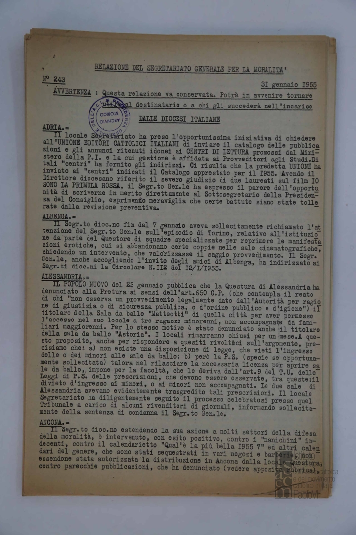 "Relazione del Segretariato Generale per la Moralità. Nr. 243"