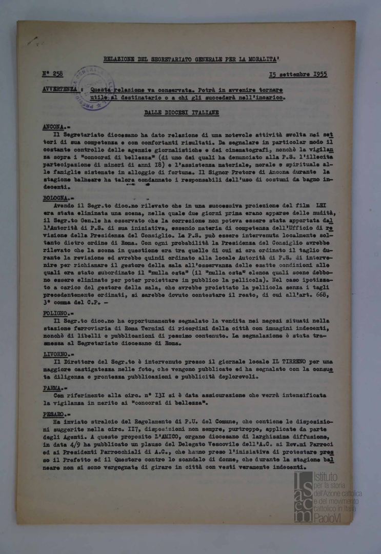 "Relazione del Segretariato Generale per la Moralità. Nr. 258"
