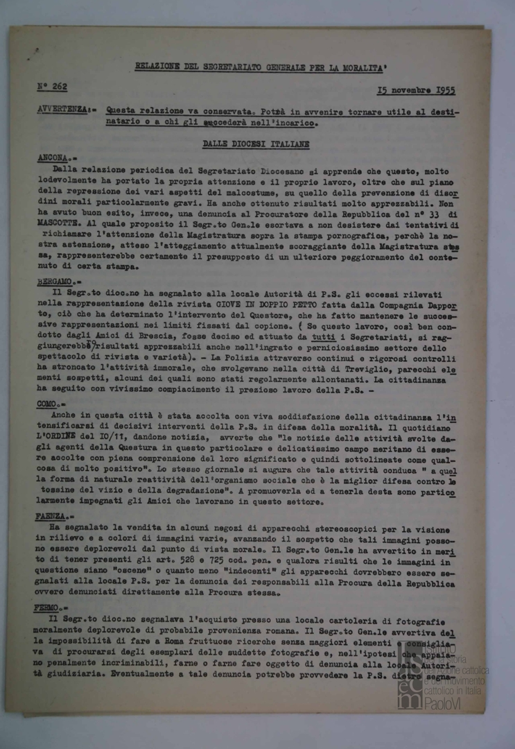 "Relazione del Segretariato Generale per la Moralità. Nr. 262"