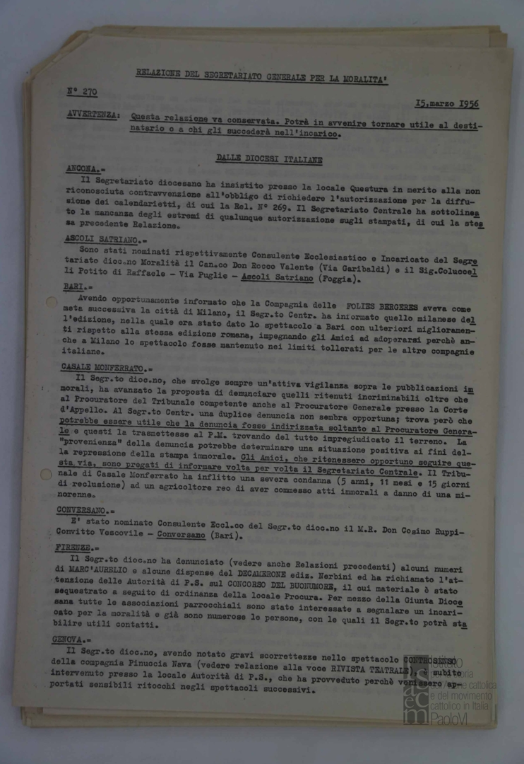 "Relazione del Segretariato Generale per la Moralità. Nr. 270"